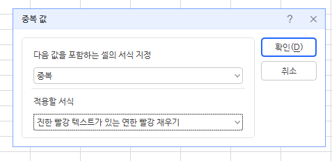 중복값이 있는경우는 연한 빨강색 배경이 채워지고 중복값이 없는경우는 채우기 없은 원래상태 그대로 데이터가 유지됩니다.