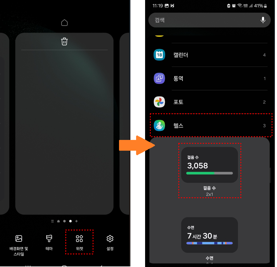 배경화면을 꾹 누르면 아래와 같이 화면 하단에 위젯 설정메뉴가 나타납니다. 위젯을 클릭하고 헬스항목을 선택하면 위젯종류가 보이는데 걸음 수 항목을 선택합니다.