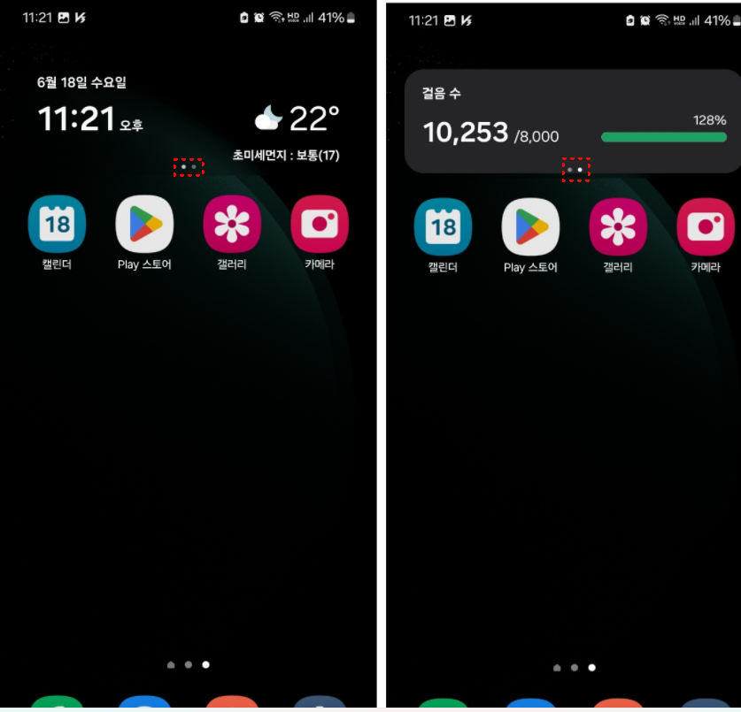 삼성헬스 위젯을 꾹 눌러서 날씨 메뉴에 같이 놓으면 아래와 같이 메뉴가 겹쳐지고 날씨메뉴 눌러서 왼쪽/오른쪽으로 터치하여 이동시키면 걸음수가 나왔다 날씨메뉴가 나왔다가 변경되며 표기됩니다.