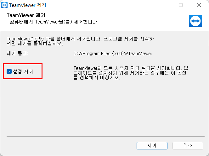 해결방법은 아주 간단합니다. 삭제 후 재설치를 하면 되고 이때 아래 이미지와 같이 설정 제거부분을 꼭 체크 해줘야 합니다. 설정 제거를 체크 하지 않고 하면 동일한ID값이 계속 유지됩니다.