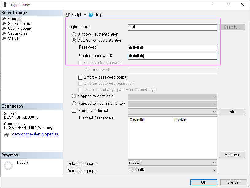 계정명을 test / 비밀번호는 1234로 해서 만들어 보겠습니다.