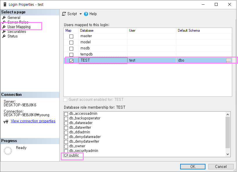 TEST데이터베이스의 있는 V_MYUSER 뷰테이블에 권한을 주기 위해서는 User Mapping을 해야되면 TEST DB항목을 체크합니다.