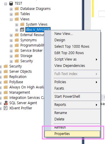 V_MYUSER뷰테이블을 선택하고 마우스우클릭 -> 속성(Properties)항목을 클릭합니다.