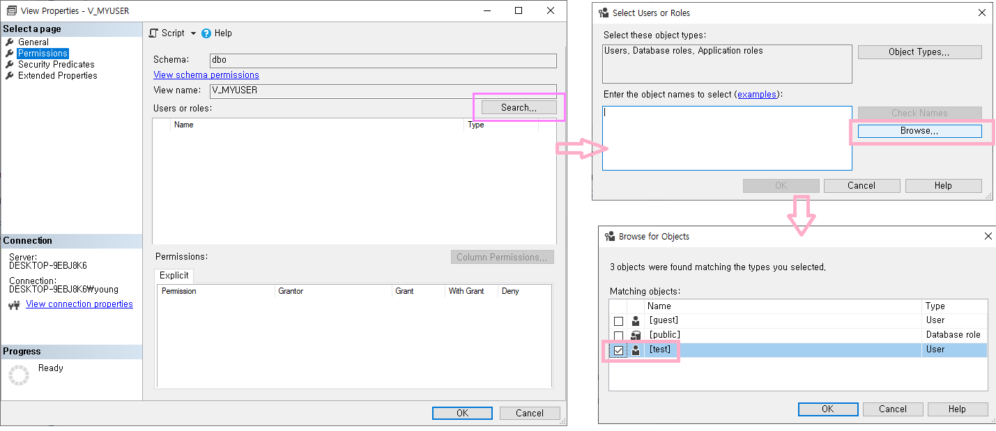 Perrmision항목에서 Search버튼 -> Browse...버튼을 클릭후 test계정을 선택합니다.