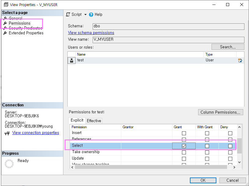 권한을 select권한만 체크한 후 OK버튼을 클릭하면 test계정으로는 V_MYUSER라는 특정뷰테이블에 조회권한만 가능하게 설정이 됩니다.
