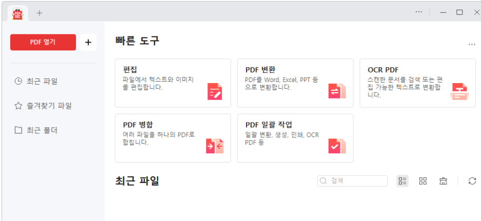 알PDF설치 후 실행하면 아래와 같은 메뉴가 나타나며 PDF파일내용을 편집, PDF파일을 Word나 Excel등으로 변환, OCR PDF라고해서 스캔한 문서를 편집가능한 텍스트로변환등 다양한 기능을 제공 하고 있습니다.