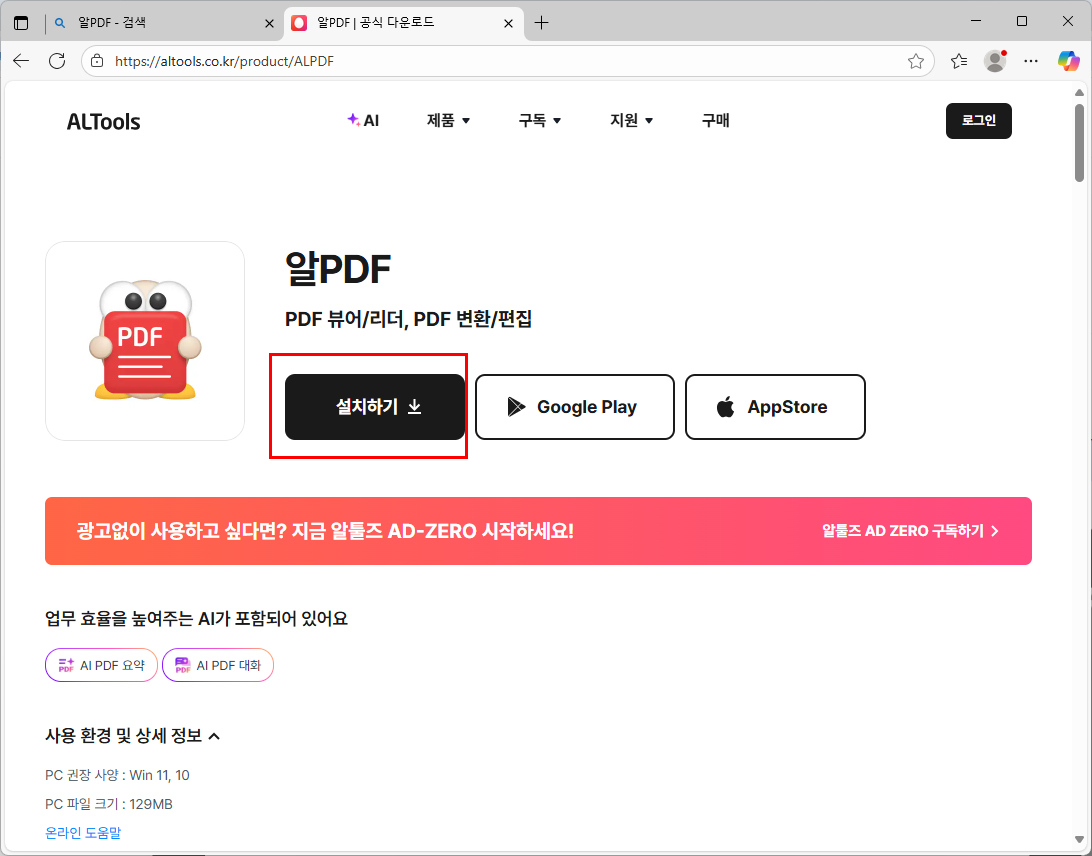 알PDF를 이용하면 PDF파일수정이 가능합니다. 네이버,구글검색엔진에서 알PDF로 검색하여 다운을 받으면 됩니다. 아래 사이트가 알PDF공식사이트(https://altools.co.kr/product/ALPDF) 입니다. 사이트에서 설치하기 버튼을 클릭하여 알PDF를 설치합니다.