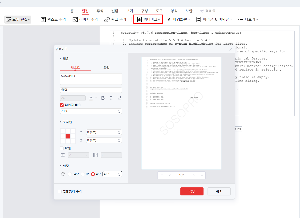 먼저 편집기능에 대해 살펴보겠습니다. 위 이미지는 PDF원본파일입니다. 편집기능을 이용하면 해당파일의 내용변경이가능 합니다. 변경하고 싶은 텍스트를 선택 후 변경처리하면 해당부분이 변경됩니다. 문서에 워터마크기능을 넣고 싶으면 워터마크항목을 클릭하면 텍스트를 입력하여 페이지비유과 색상을 지정해서 워터마크표시가 가능합니다.