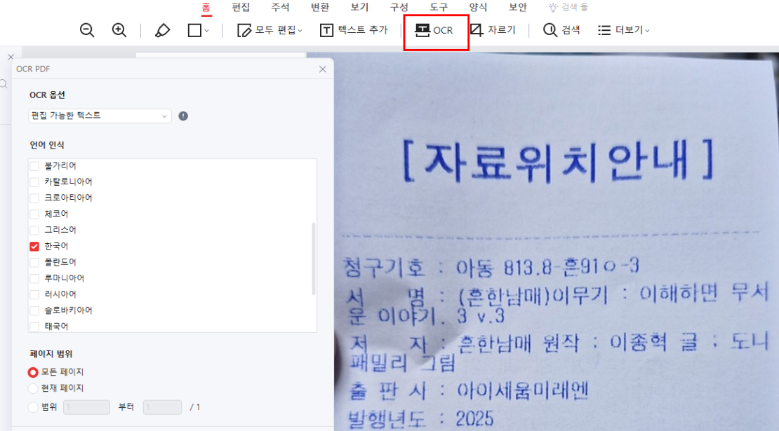 OCR PDF기능을 이용해서 사진이나 스캔된 자료를 글자로 변경해주는 부분을 시험해보았습니다.