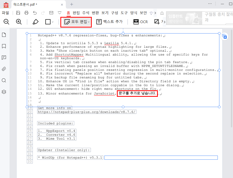OCR을 클릭하면 언어인식관련 항목이 나오고 한국어,영어를 선택후에 적용을 하면 아래와 같이 글자데이터로 변환된 부분을 확인 할수 있ㅅ브니다. 테스트용지가 초록색이고 흐려서 그런지 인식을 하지 못하는 데이터들이 많이 있네요. 아마 A4용지의 제대로 인쇄된 부분으로 테스트해봤으면 더 좋지 않았을까 싶습니다. AI기술이 점점 고도화 되면 글자자동인식되는것도 정확해질듯하네요. PDF파일을 받으면 간혹 수정하고 싶은 경우가 있었는데 알PDF를 사용해서 편집하여 사용해보시기 바랍니다.