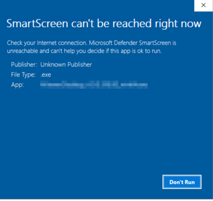 윈도우 2022서버에서 아래와 같이 SmartScreen can't be reached right now 메세지 발생하여 exe실행 및 설치파일이 설치가 되지 않을 경우 해결 방법입니다.