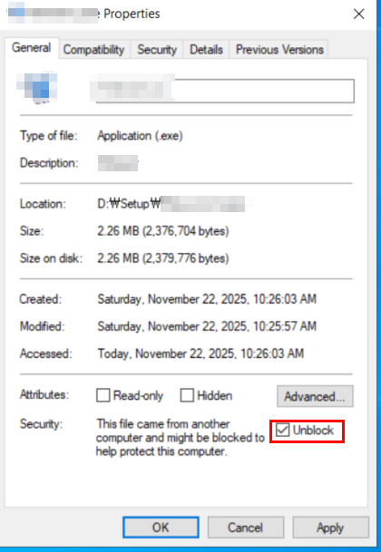 exe파일을 선택 후 마우스 우클릭하여 Propeties(속성값)을 누르면 Security항목에 This fiel came from another computer and ...항목이 나오는데 Unblock부분을 체크해주면됩니다. 다시 실행해보면 정상동작되는 부분을 확인 할 수 있습니다.