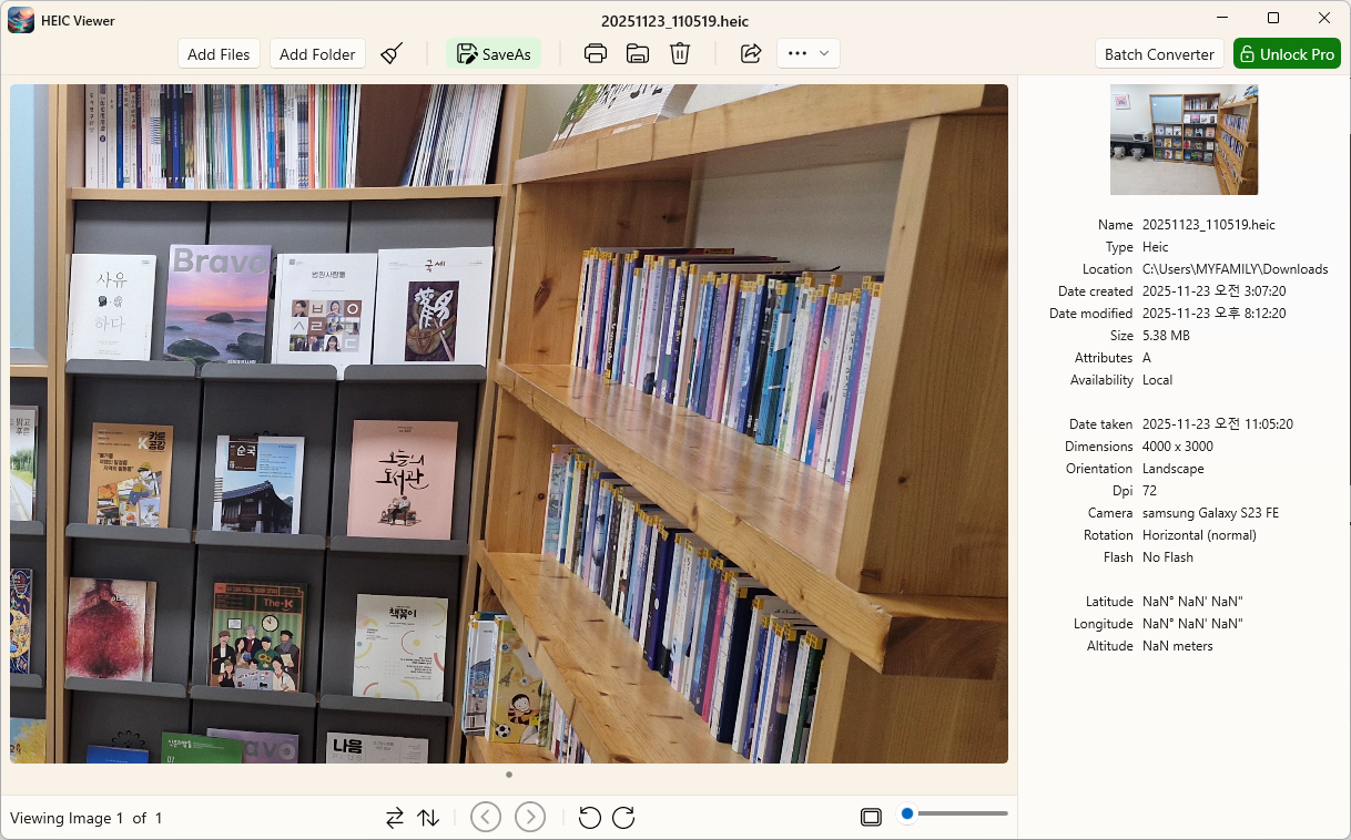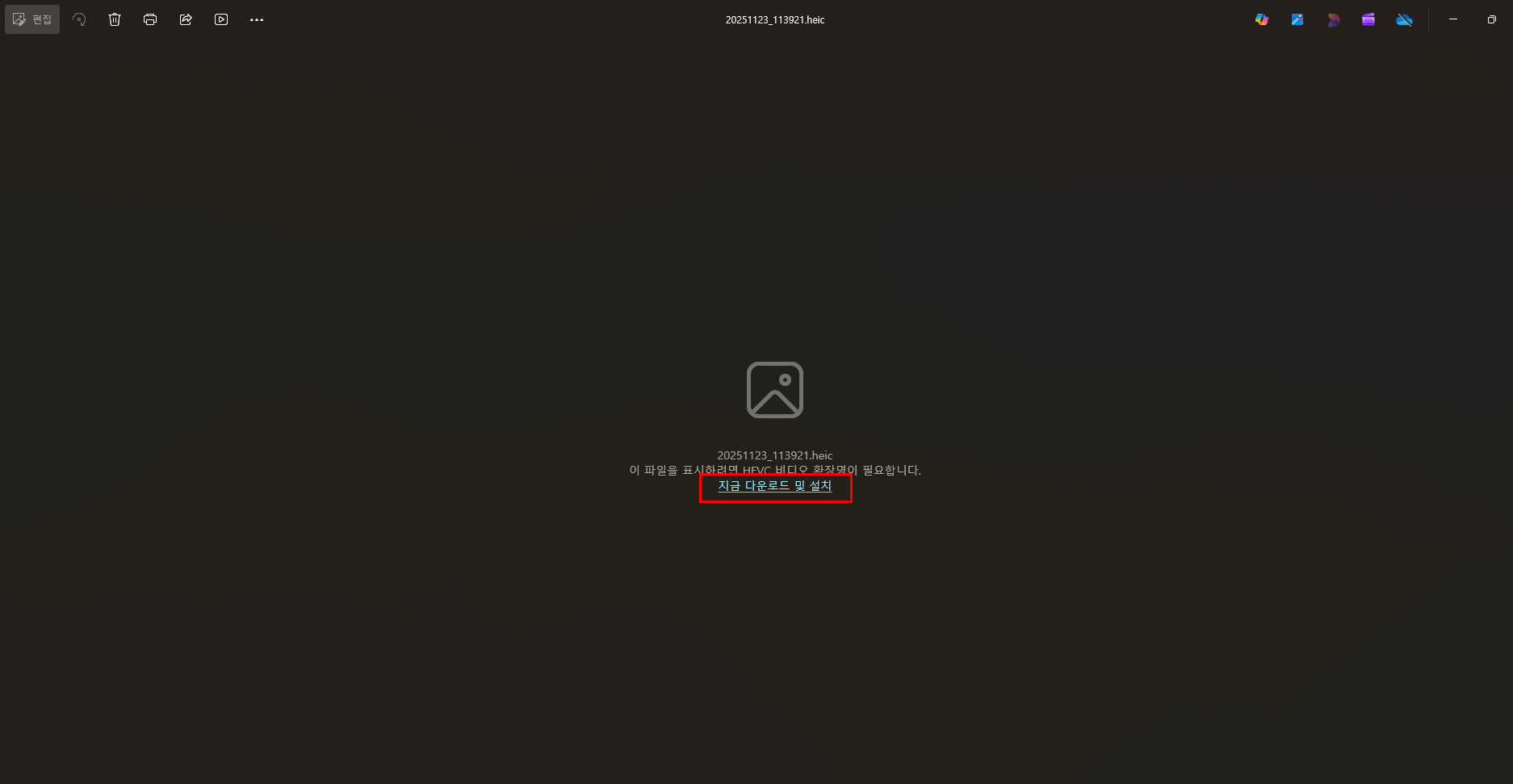 갤럭시로 촬영한 데이터를 윈도우로 열었는데 아래와 같이 .heic확장자를 가진 파일이 열리지가 않습니다. 해당파일을 열기 위해서는 Heic파일을 열수 있는 전용 Viewer설치가 필요합니다.