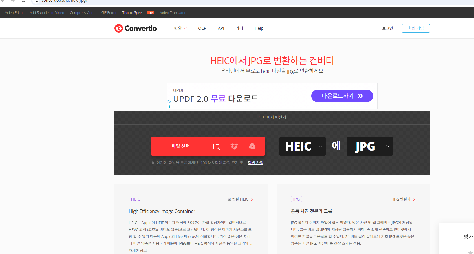 프로그램 설치 없이 온라인으로 변환하는 방법입니다. https://convertio.co/kr/heic-jpg/ 사이트에 접속하여 변경하고 싶을 파일을 선택하여 업로드 하거나 드래그앤 드록합니다.