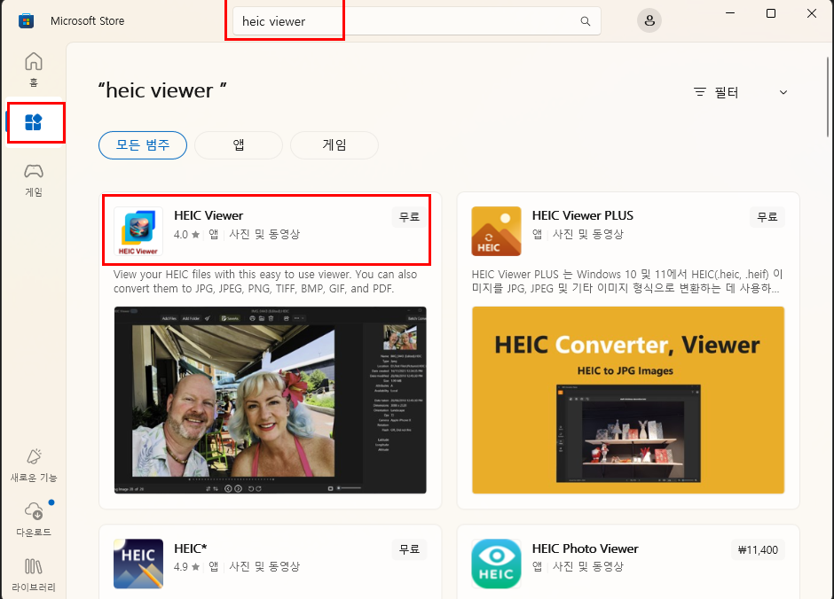 Micorsoft Store에서 heic viewer항목으로 검색을 하면 무료 Viewer가 여러가 나오는 부분을 확인 할 수 있ㅅ브니다. HEIC Viewer를 선택하여 설치합니다.