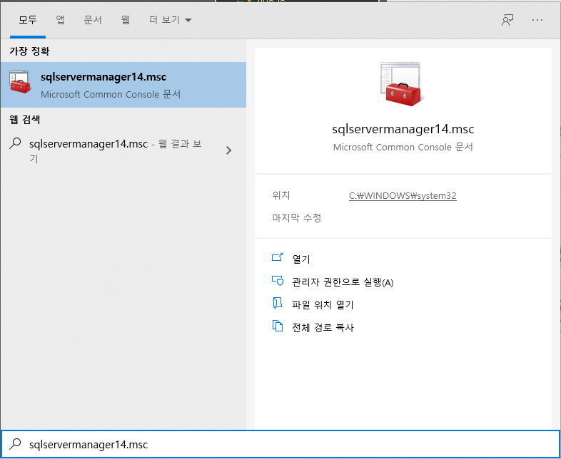 SQL Server 2017 구성관리자를 실행합니다. 메뉴에 해당항목이 보이지 않을경우 실행창에 sqlservermanager14.msc를 입력후 실행합니다.
