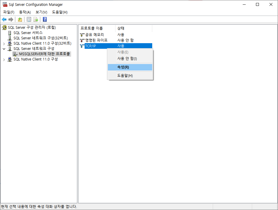SQL 구성관리자 -> SQL Server 네트워크 구성 -> MSSQLSERVER에 대한 프로토콜 항목의 TCP/IP 속성을 클릭합니다.