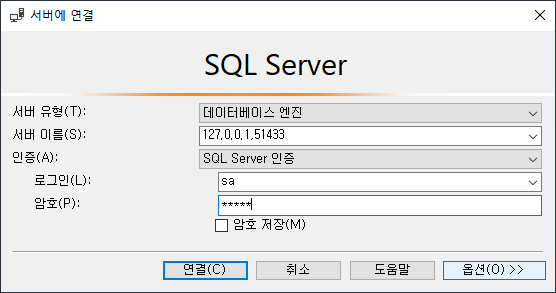 SQL서비스를 다시시작후 로그인해보면 해당포트로 변경되어서 로그인되는것을 확인할수 있습니다. 서버접속시 서버이름을 서비스명칭,포트번호로 입력하면됩니다. EX) 127.0.0.1,51433