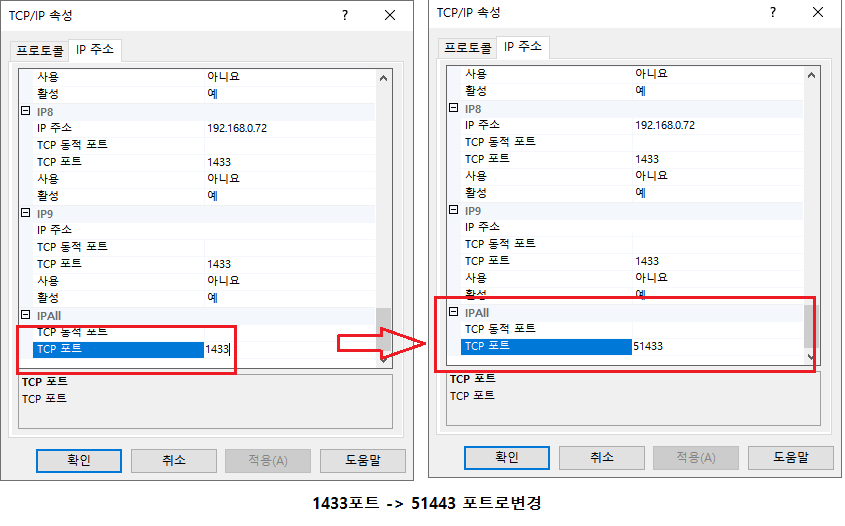 TCP/IP속성의 IP주소탭에서 IPALL항목중 TCP포트번호값이 기본 1433이부분에서 변경하고 싶은 포트번호를 입력후 확인버튼을 클릭합니다. 51443포트로 변경해보도록 하겠습니다. 포트변경후 서비스를 재시작해야만 변경된 내용이 적용됩니다.