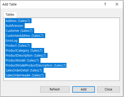 전체테이블을 선택후 Add버튼을 클릭합니다.