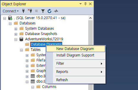 먼저 데이터베이스-> Database Diagrames -> New Database Diagram을 선택합니다.