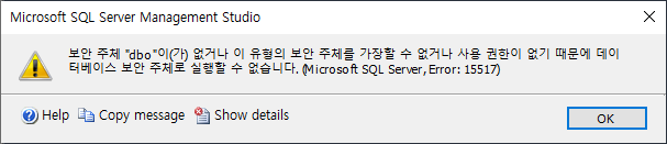 아래와 같이 보안 주체 "보안 주체 "dbo"이(가) 없거나 이 유형의 보안 주체를 가장할 수 없거나 사용 권한이 없기 때문에 데이터베이스 보안 주체로 실행할 수 없습니다. (microsoft sql server, error: 15517) 라는 경고메세지가 나오면 권한이 부여되지 않아서 실행할수 없는 문제입니다.
