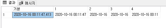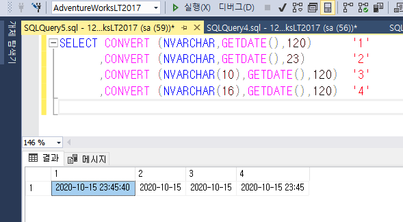 1 2 3 4 5 | SELECT GETDATE() '기본' ,CONVERT (NVARCHAR,GETDATE(),120) '1' ,CONVERT (NVARCHAR,GETDATE(),23) '2' ,CONVERT (NVARCHAR(10),GETDATE(),120) '3' ,CONVERT (NVARCHAR(16),GETDATE(),120) '4' | |