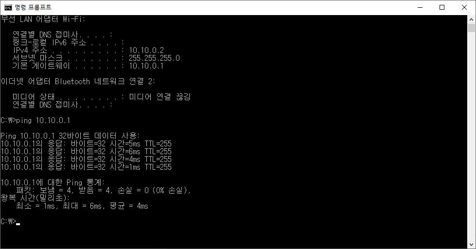 도스창에서 ipconfig로 pc아이피를 확인하면 10.10대역으로 ip가 할당된것을 확인할수 있습니다.