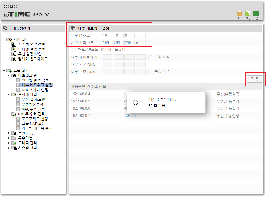 10.10대역으로 변경해보도록 하겠습니다. 고급설정-> 내부 네트워크설정 -> 내부 네트워크 설정항목에 내부ip주소 대역을 입력후 적용버튼을 클릭합니다. 해당부분을 적용하면 공유기가 재시작되니 주의하셔서 설정하시기 바랍니다.