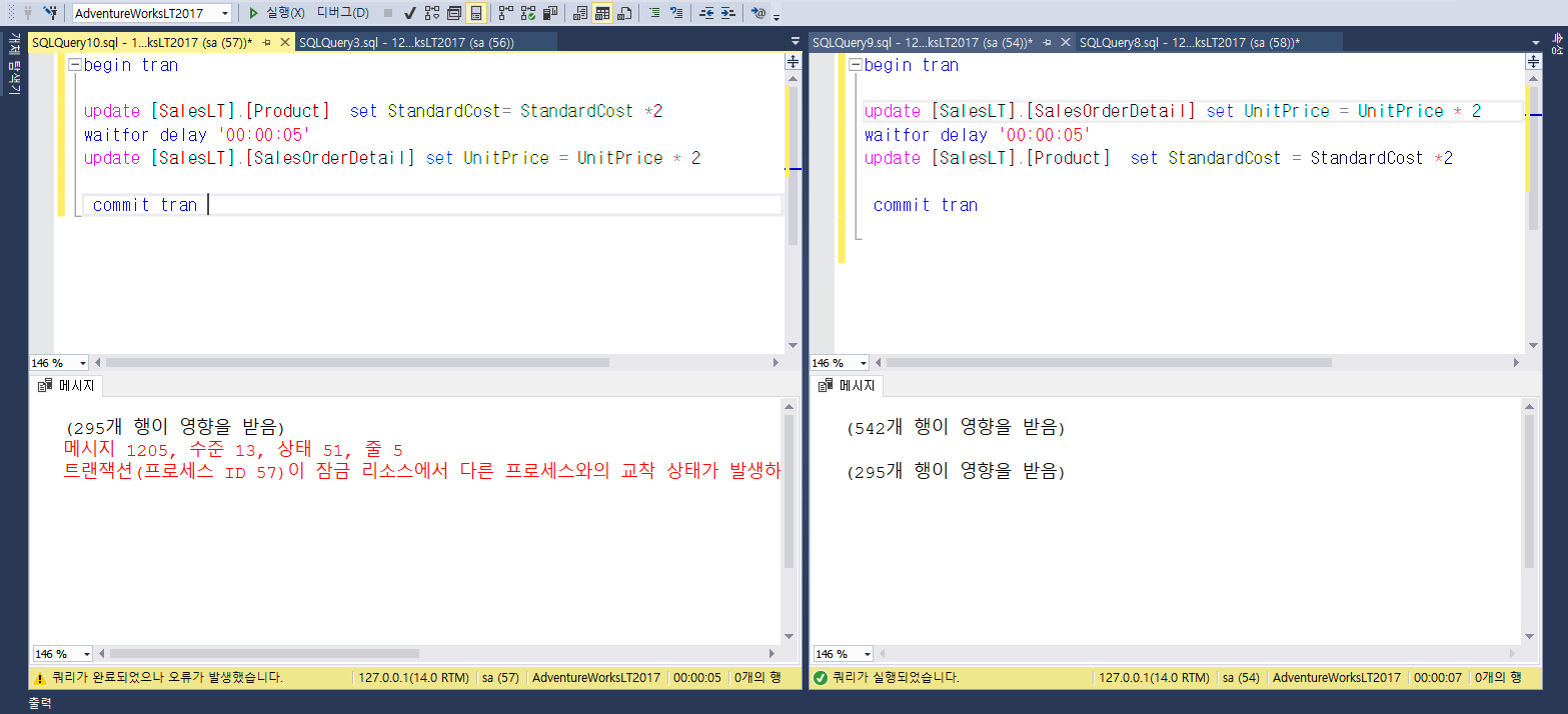 실제로 데이터베이스상에서 데드락을 발생시켜보겠습니다. 강제로 waitfor delay를 사용하여 update구간에 5초 대기를 시켜보면 아래와 같이 교착상태가 발생하는것을 알수있습니다.