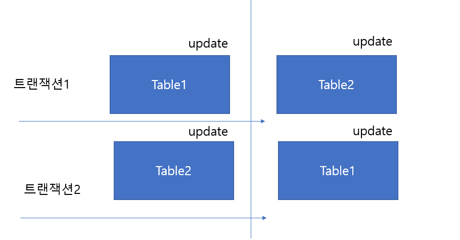 아래 그림과 같이 트랜잭션1이 Table1을 업데이트후 Table2를 업데이트 하려고 할때, 트랜잭션2가 이미 Table2에 업데이트 작업을 진행중인 경우 해당작업을 완료할 때까지 대기후 처리합니다. 트랜잭션2가 Table2업데이트 완료후 Table1을 업데이트 하려고 할때 트랜잭션1이 Table1의 작업을 하고 있어서 완료 될때까지 대기한다. 이렇게 두개의 트랜잭션작업이 서로 완료 될때까지 기다리게되며 결과적으로 아무것도 완료가 되지 않는 상태가됩니다.이렇게 해서 교착상태가 빠지게 됩니다.
