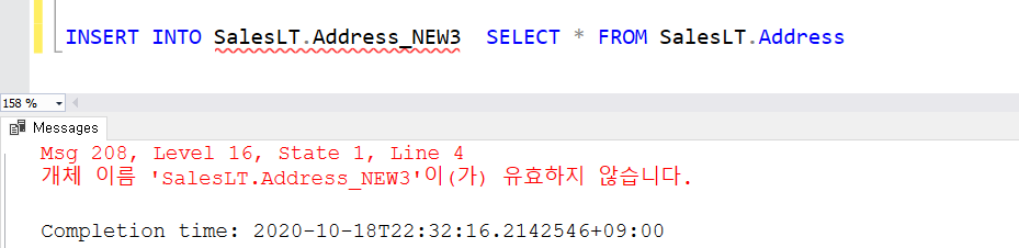 SELECT INTO와 동일하지만 테이블이 없는 상태에서는 아래와 같이 오류가 나타납니다.