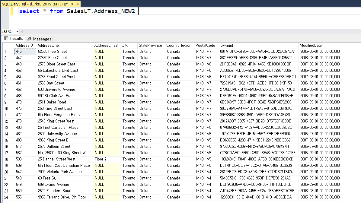 SalesLT.Address_New2테이블을 보면 아래와 같이 City값이 Toronto인데이터만 복사된것을 확인할수 있습니다.