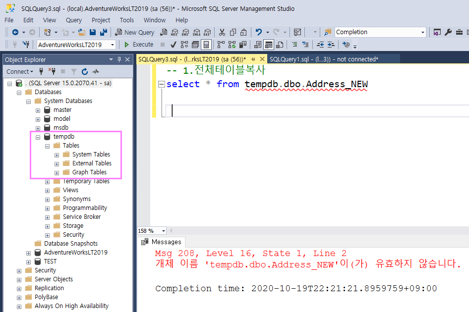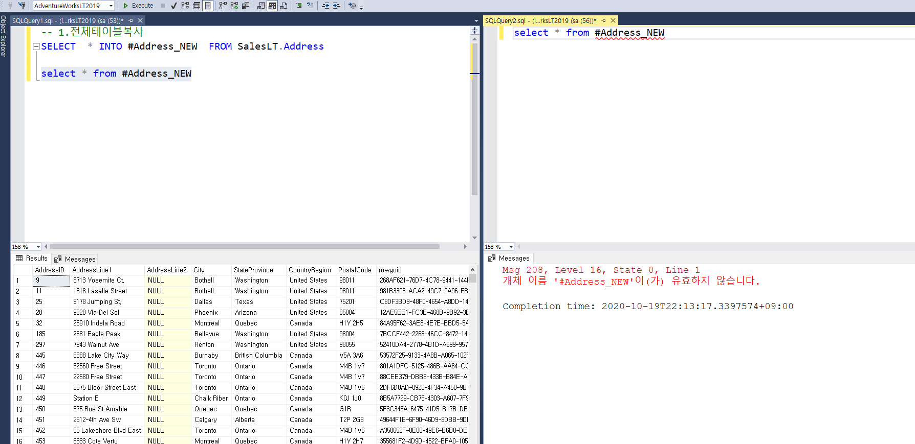 테이블명칭앞에 #을 붙이면됩니다. #Address_New테이블으로 데이터를 복사해보겠습니다. 왼쪽 이미지와 같이 테이블이 복사된것을 확인할수 있으면 다른 세션에서 조회시에는 개체이름이 유효하지 않다며 "Msg 208, Level 16"에러메세지를 표출합니다.