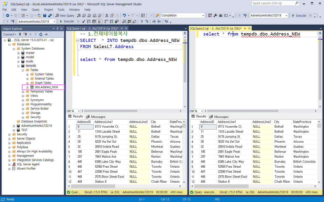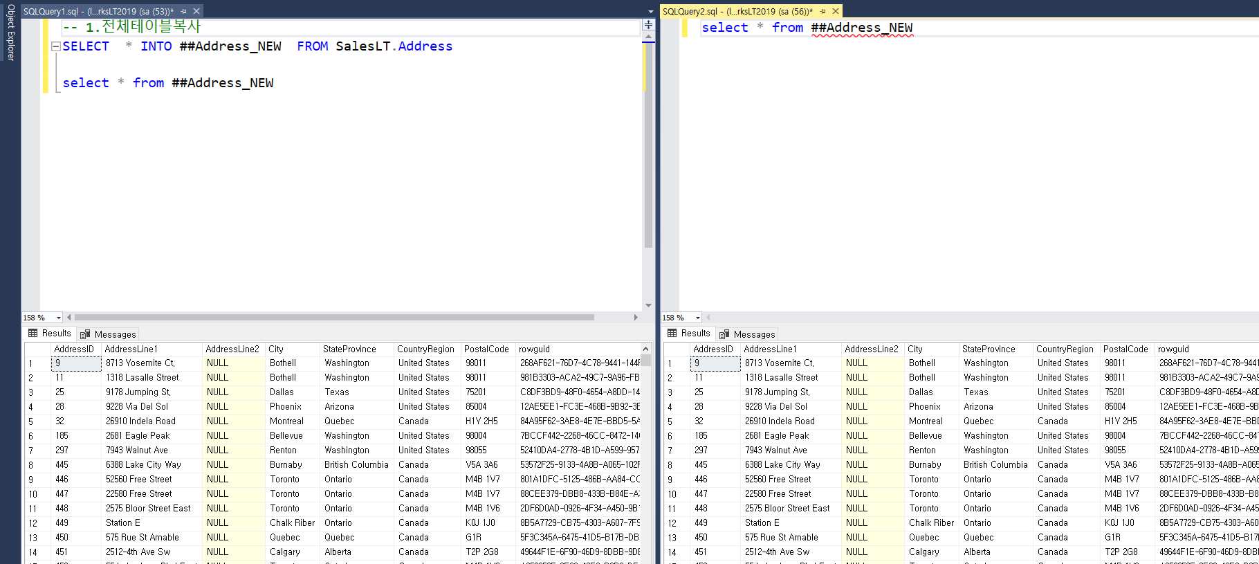 테이블명칭앞에 #을 두개 붙이면됩니다. ##Address_New테이블으로 데이터를 복사해보겠습니다. 왼쪽 이미지와 같이 테이블이 복사된것을 확인할수 있으면 다른 세션에서 조회시에도 결과가 조회되는것을 확인할수 있습니다.