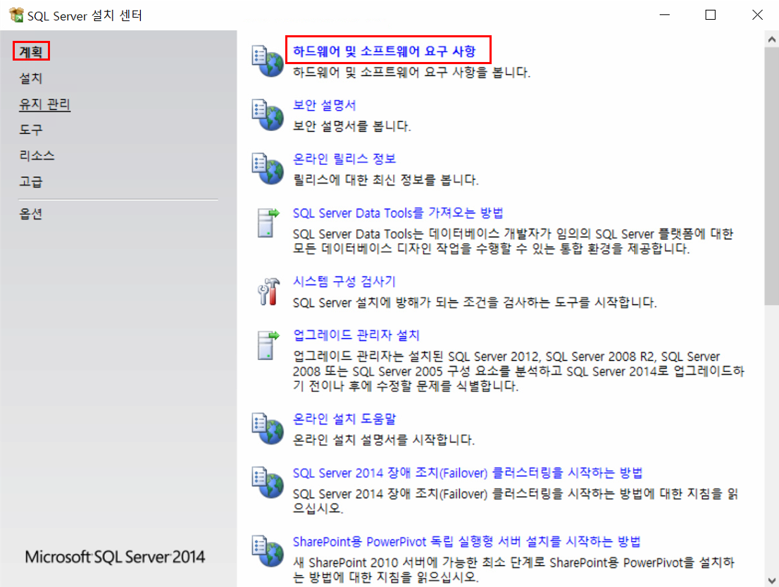 MSSQL 서버설치방법에 대하여 알아보겠습니다. setup.exe를 실행합니다. 해당파일을 실행하면 SQL설치센터 화면이 나타납니다.