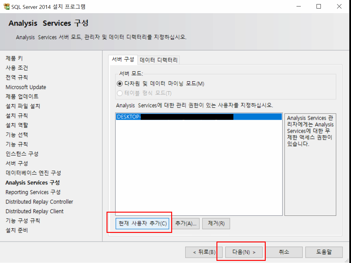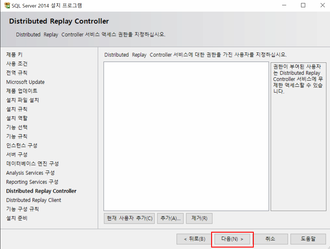 최소1명이상의 사용자가 있어야하므로 현재사용자추가 버튼을 클릭 후 다음버튼을 클릭합니다.