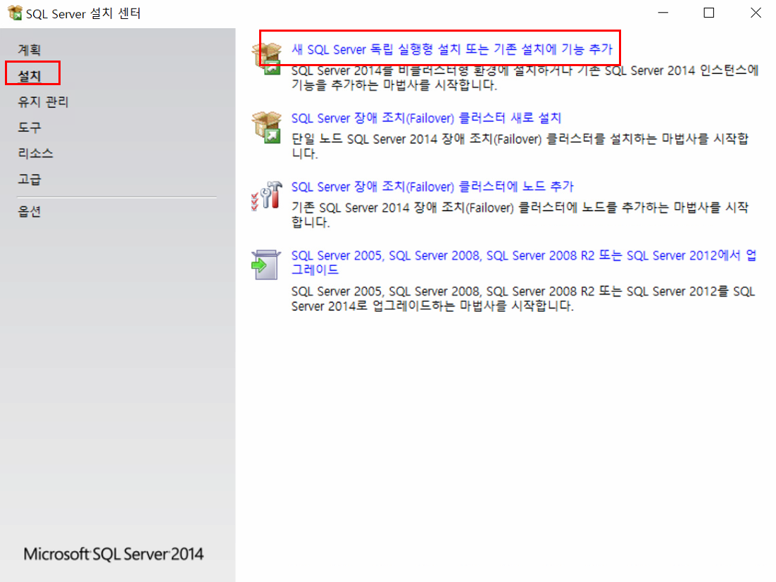 왼쪽의 설치메뉴를 클릭하면 아래 이미지와 같이 나타나며 새 SQL Server 독립실행형 설치 또는 기존 설치에 기능추가를 선택합니다.