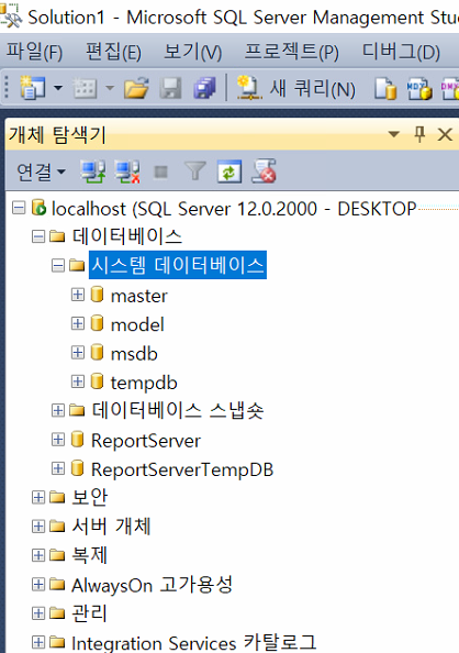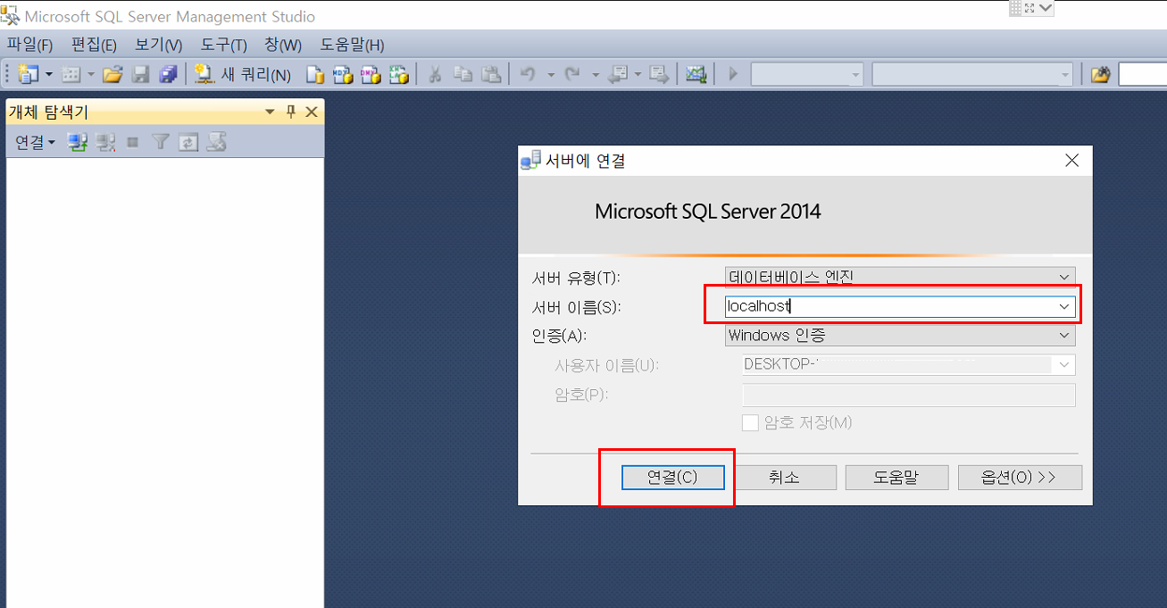 서버이름에 localhost를 입력후 연결을 하면 아래와 같이 SQL서버가 정상설치된것을 확인할수 있습니다.