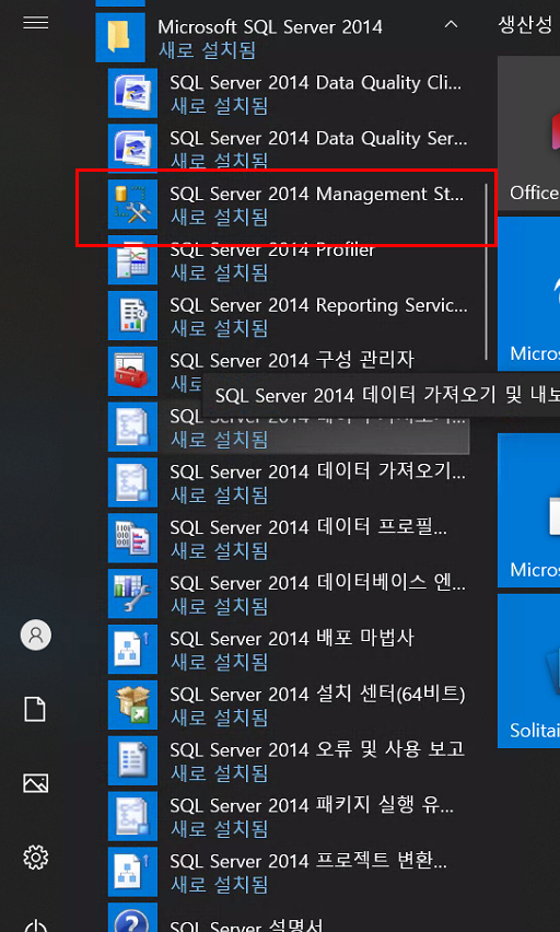 설치완료 후 서비스가 정상으로 동작하는지 확인해보도록 하겠습니다. 윈도우 메뉴에 SQL Server항목에 Managemenet Studio를 실행합니다.