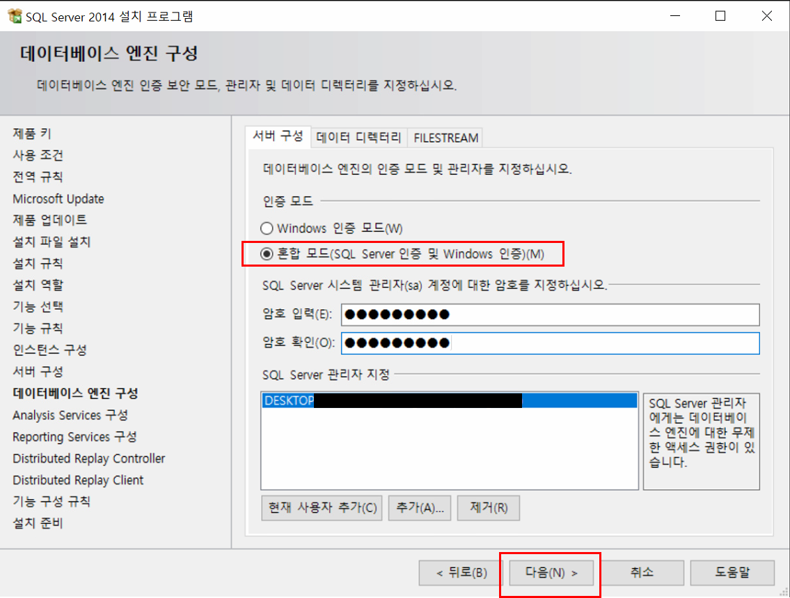 인증모드는 혼합모드인증으로 하여 진행하겠습니다.