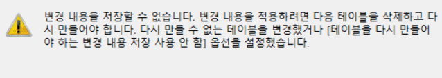 아래그림과 같이 테이블을 변경하고 저장할때 변경되지 않을때 "변경 내용을 저장할수 없습니다. 변경 내용을 적용하려면 다음 테이블을 삭제하고 다시 만들어야 합니다. 다시만들 수 없는 테이블을 변경하거나 [테이블을 다시 만들어야 하는 변경 내용 저장 사용 안 함] 옵션을 설정했습니다." 라는 경고메세지와 함께 테이블 정보가 변경되지 않는 문제 해결방법에 대해서 알아보겠습니다.