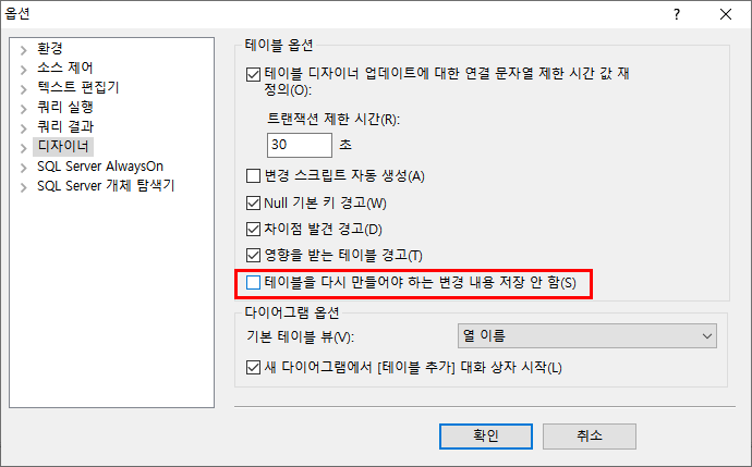 옵션항목 -> 디자이너탭을 클릭 -> 테이블을 다시 만들어야 하는 변경 내용 저장 안 함 체크를 해제합니다. 해당부분을 해제후 테이블을 변경하면 변경되는 부분을 확인할수있습니다.