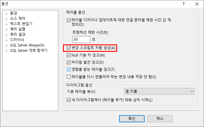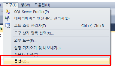 SQL Managemnet -> 도구 -> 옵션 항목을 선택합니다.