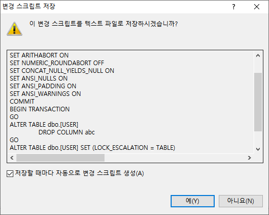 추가로 거꾸로 테이블정보를 변경시 해당부분에 대한 스크립트를 알고 싶을때는 "변경 스크립트 자동생성" 항목을 체크하면 아래와 같이 변경된 내용을 스크립트파일로 저장할수 있습니다.
