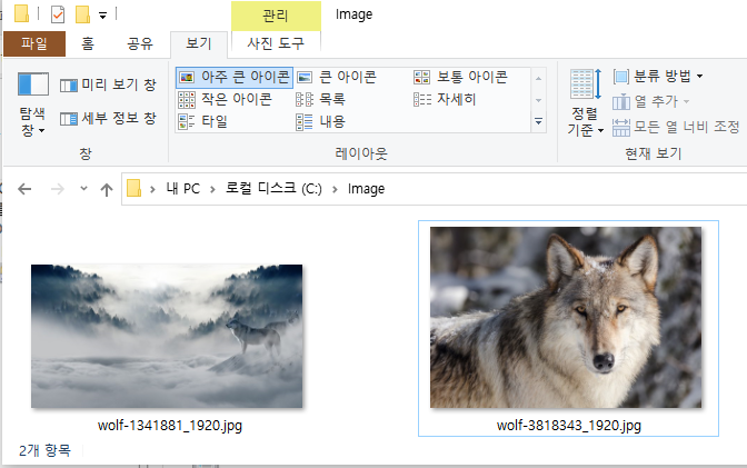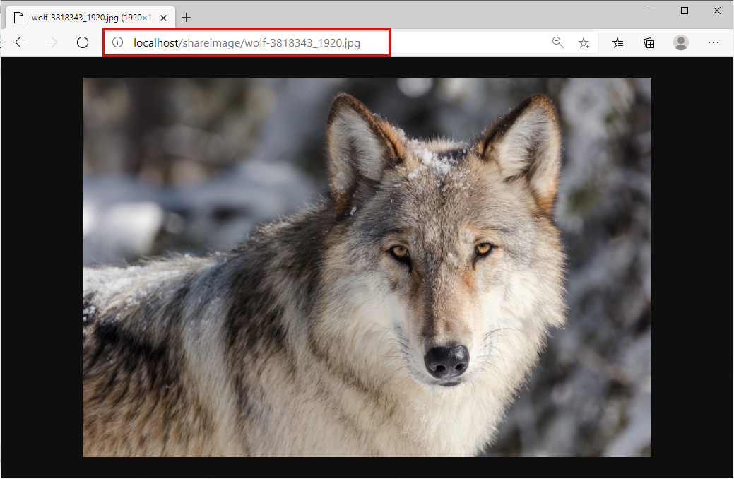 이제 브라우저상에서 url을 호출해보도록 하겠습니다. 실제서버에 저장된이미지 (C:\\Image\\wolf-3818343_1920.jpg)을 웹브라이저상에서 호출하겠습니다. 가상디렉토리를 shareimage로 하였기때문에 다음과 같이 url을 호출하면 브라우저 상에서 이미지가 나오는것을 확인할수 있습니다. http://localhost/shareimage/wolf-3818343_1920.jpg