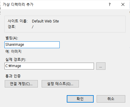 가상으로 사용할 디렉토리의 이름을 임의로 입력합니다. 실제경로에는 실제 서버의 디렉토리를 추가합니다. 디렉토리를 추가하면 사이트 하위트리에 디렉토리 폴더항목이 나타납니다.