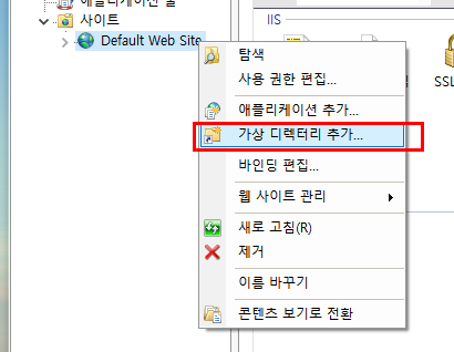 IIS웹서버에서 가상의 디렉토리를 설정하여 이미지파일을 프로그램상에서 볼수있도록 설정해보도록 하겠습니다. 먼저 사이트주소를 선택 후 마우스 우클릭하여가상 디렉터리 추가를 선택합니다.