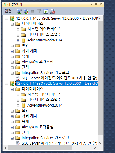 SQL Management로 1443, 14330포트에 접속해보도록 하겠습니다. 아래와 같이 동일서버에 접속되는것을 확인할수 있습니다.