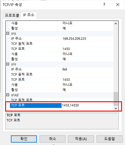 TCP/IP속성에 TCP포트에 1433, 14330 이렇게 두개를 지정합니다. 콤마로 구분하여 여러개 포트를 지정할수 있습니다. 포트를 설정 후 서비스를 재 시작하여 두개의 포트로 서버스가 동작되는것을 확인할수 있습니다.